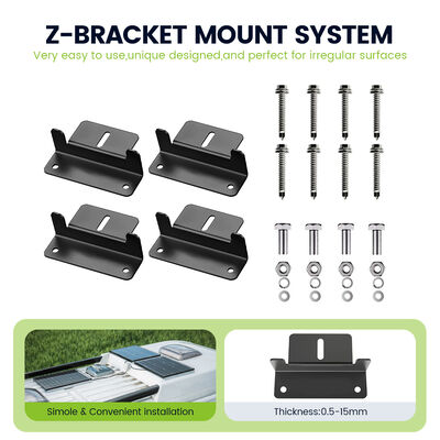 L'installazione è semplice con opzioni di montaggio fisso incluse nel kit.Queste soluzioni di montaggio sono progettate per attaccare in modo sicuro il pannello solare al tetto del vostro camper o a qualsiasi altra superficie adatta, che garantisce un'esposizione solare ottimale e il massimo assorbimento di energia.prevenzione di eventuali danni al pannello solare causati da movimenti o vibrazioniQuesta caratteristica è particolarmente utile per coloro che frequentano la strada e desiderano un sistema solare durevole e di lunga durata in grado di resistere ai rigori del viaggio.